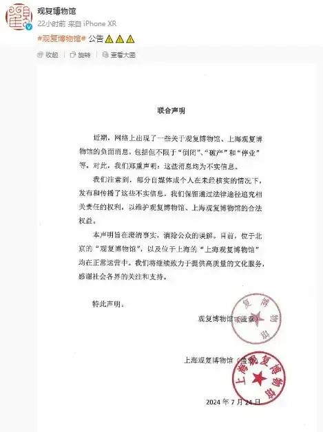 今年7月,网络上传出关于观复博物馆“倒闭”、“破产”和“停业”等负面消息。对此,观复博物馆很快在社交媒体上进行回应。声明称:这些消息均为不实信息。声明提到:我们注意到,部分自媒体或个人在未经核实的情况下,发布和传播了这些不实信息。我们保留通过法律途径追究相关责任的权利,以维护观复博物馆、上海观复博物馆的合法权益。
