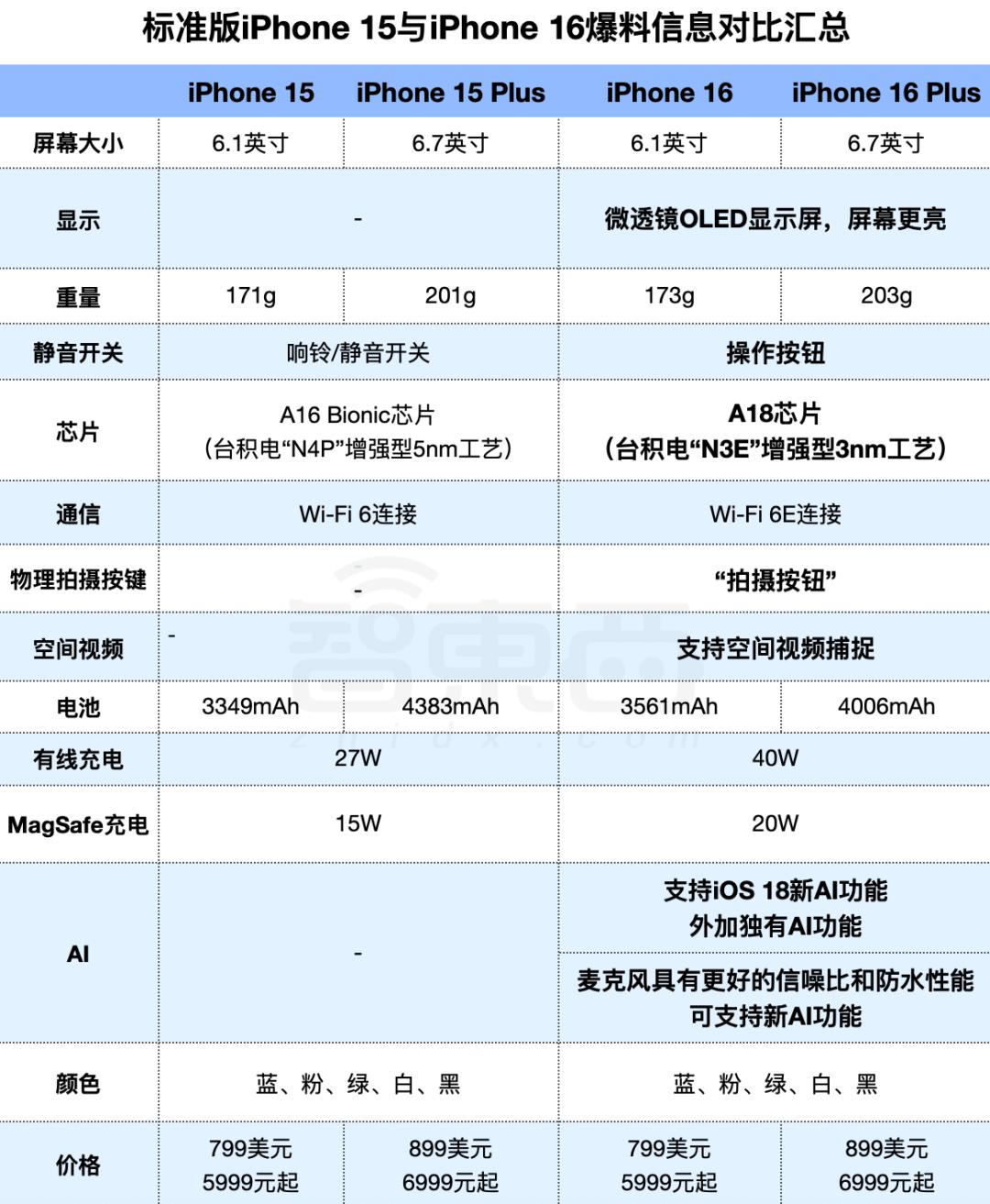 ▲标准版iPhone 15与iPhone 16爆料信息对比汇总