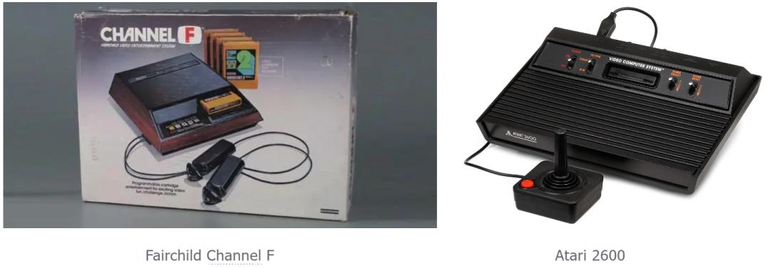 Fairchild Channel F采用了一种叫作“储存器驱动器”的技术,使得游戏卡带能够更换和使用。同年Atari公司在美国推出了Atari 2600,也史上第一部真正意义上的家用游戏主机系统,可以称得上是现代游戏机的始祖,真正将游戏卡带发扬光大。