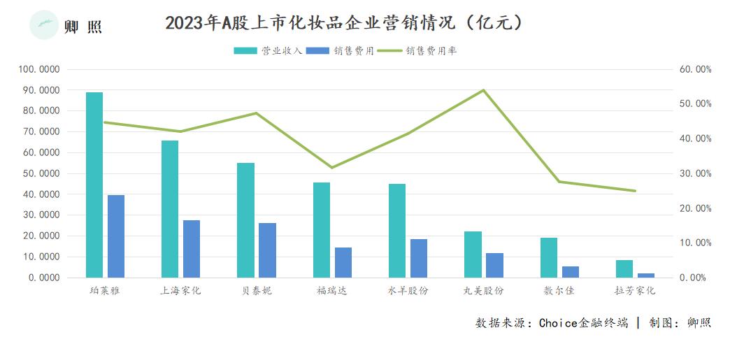 根据申万行业分类,A股32家上市的美容护理企业,在2023年合计产生911.85亿元收入,同期销售费用245.81亿元,行业销售费用率均值高达26.91%。其中,8家To C的品牌化妆品企业的平均销售费用率高达41.58%,贡献了近六成销售费用。
