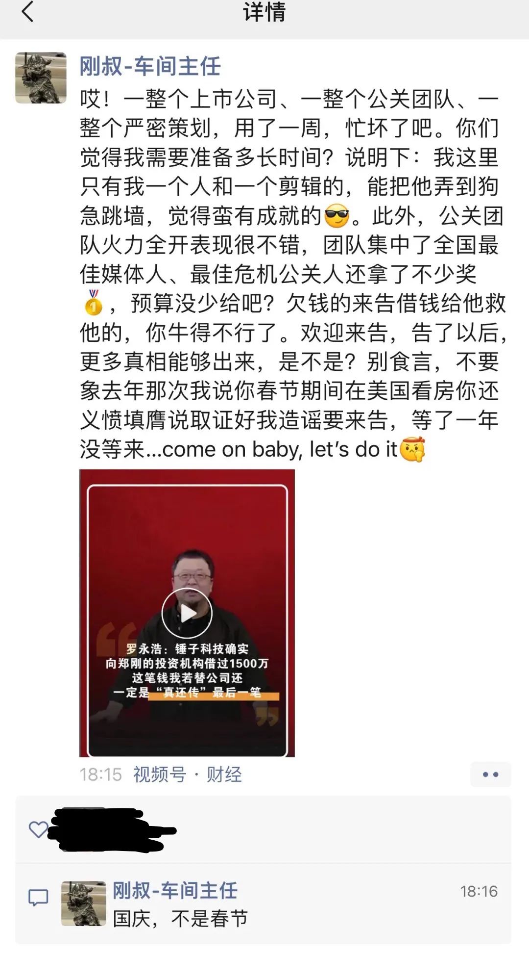 “当郑刚联系锤子科技要求还款时,我觉得又好气又好笑,就让同事答复他:如果你要谈朋友感情,那我就个人掏腰包替锤子科技公司还你们公司这笔钱,但既然谈朋友感情,你就不能跟我耍无赖,在明明有白字黑字条款的情况下还打流氓官司逼我回购,也不能天天在网上辱骂我;如果你要跟我不谈朋友感情,一切公事公办,那公对公的借款,就不要让我个人替公司还款,这才叫公事公办。”罗永浩表示。