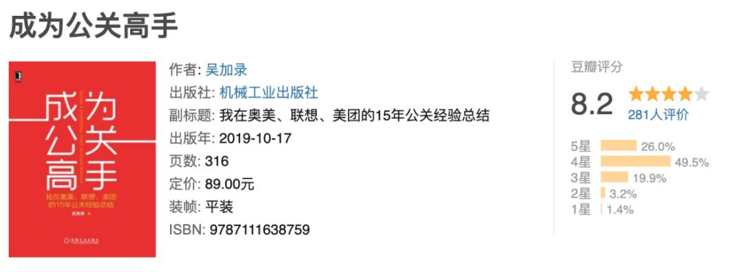 交个朋友的确有公关行业知名人士加盟。据豆瓣显示,交个朋友公关副总裁吴加录,先后在新浪网、奥美、联想集团、华夏幸福和美团就职。分别以乙方和甲方的身份,操作过多个传播量在百万级别以上的经典的公关案例,同时也收获了艾菲奖(EFFIE AWARDS)、戛纳国际创意节公关奖等一系列“公关奥斯级”的奖项。他还曾出版过《成为公关高手》一书,豆瓣评分8.2。