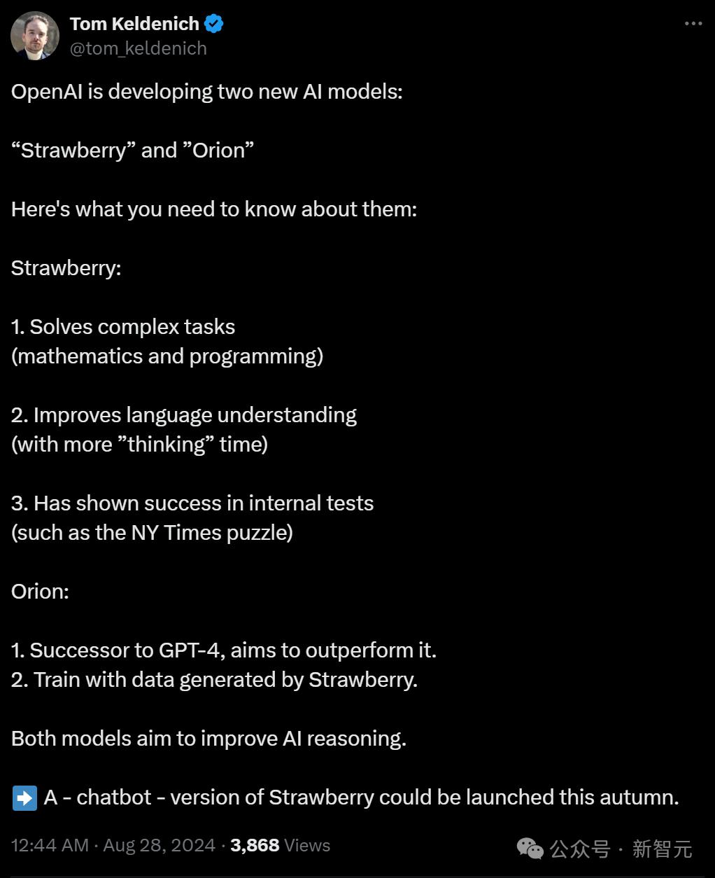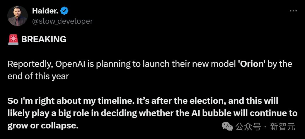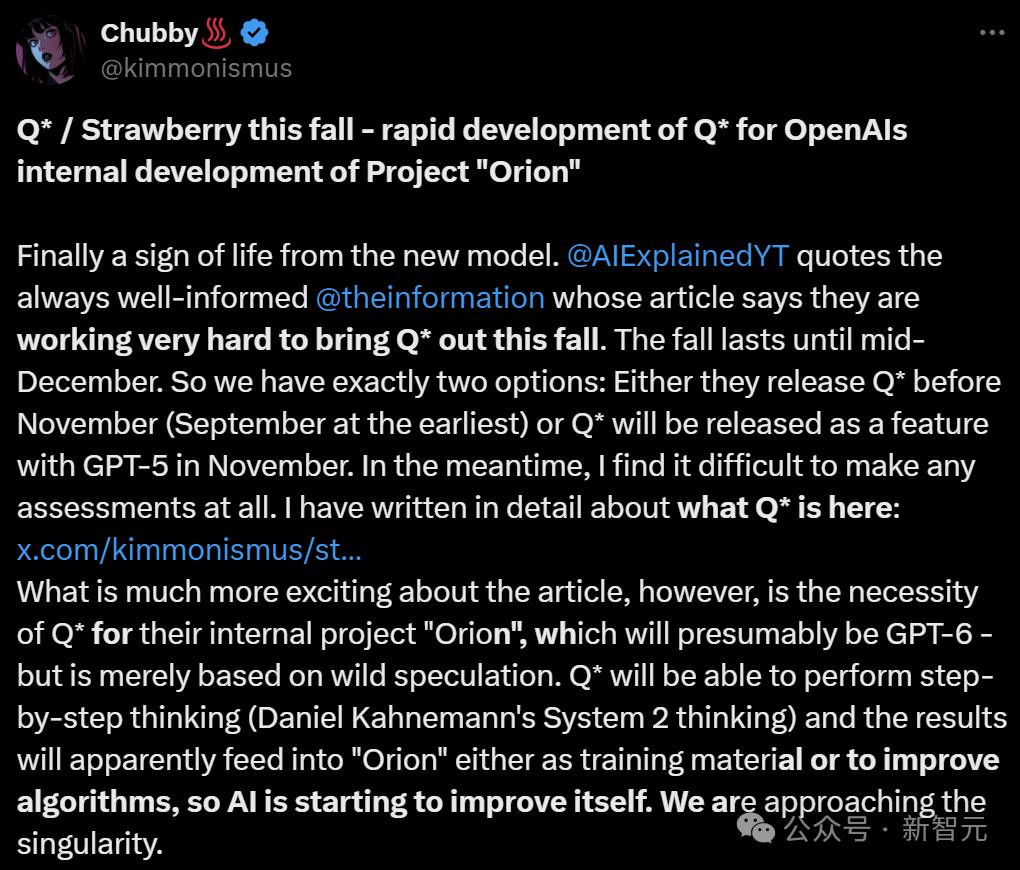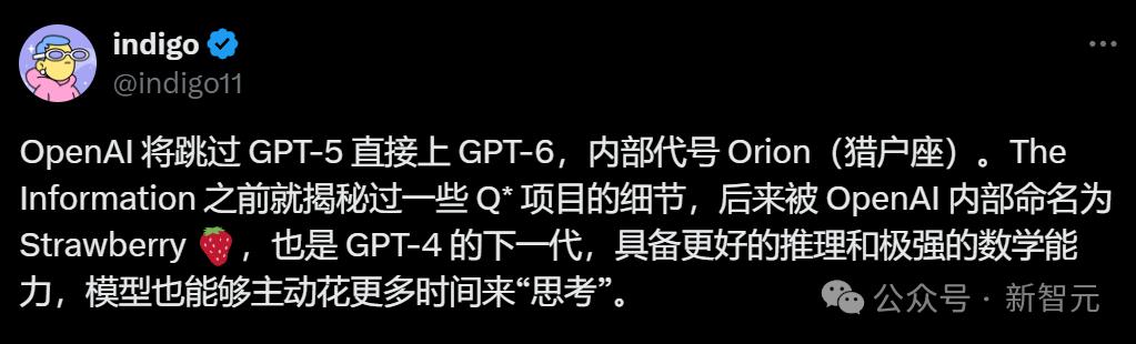 根据The Information的信息,网友推测:「GPT-4+草莓」会在秋季推出,之后上线的继任者「猎户座」可能就是GPT-5。