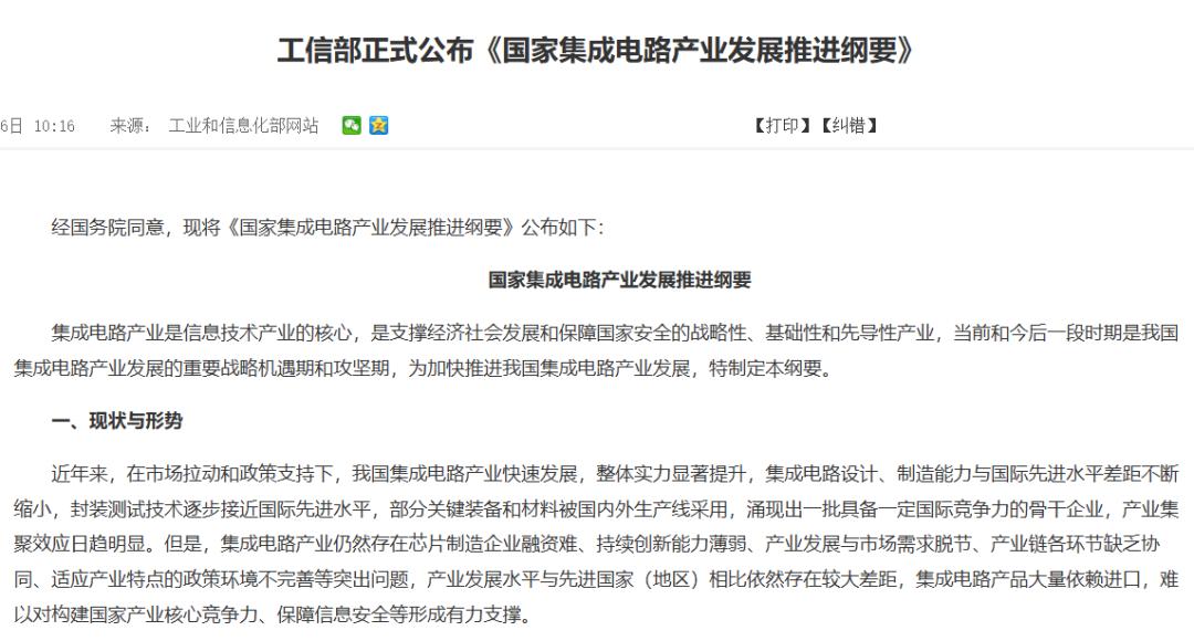 为了提高自主率,2014年国务院日前印发《国家集成电路产业发展推进纲要》:到2020年集成电路产业与国际先进水平和差距逐步缩小;到2030年集成电路产业链主要环节达到国际先进水平。