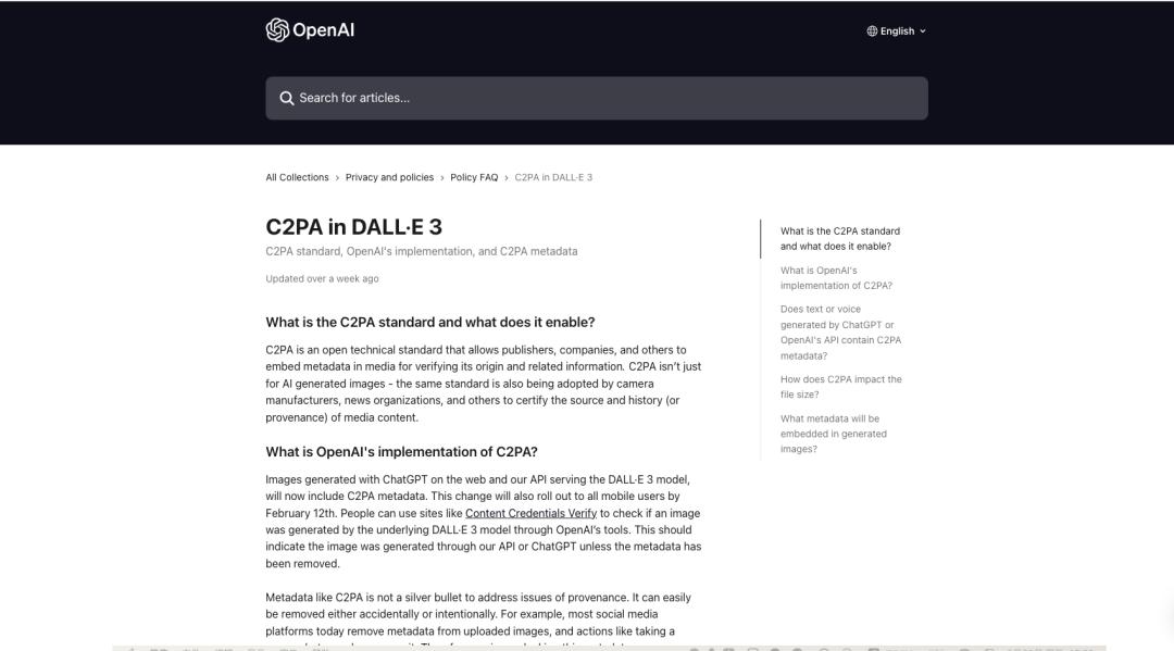 上周 OpenAI 更新了自己的隐私与政策页面,更新了一部分 DALL·E 的 C2PA 条款,所有在 GPT 网络上生成的图像(包括通过 API 执行生成的),都会被嵌入元数据,表明它的生成工具是什么。