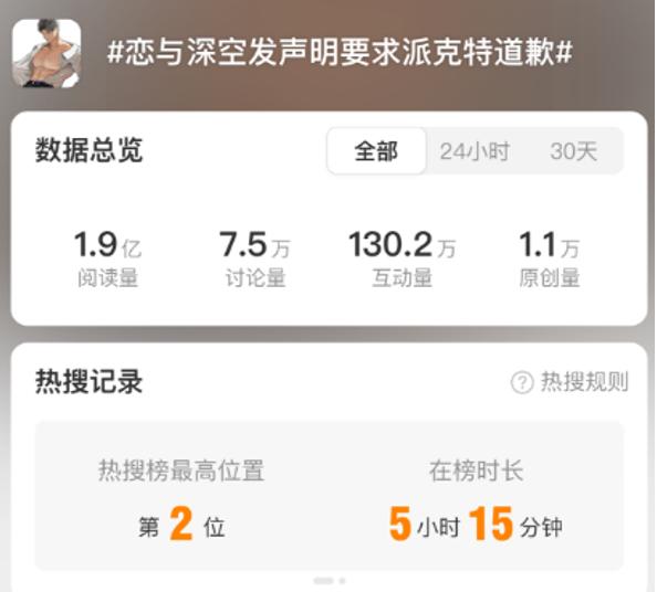 派克特发 diss 上热搜,恋与深空发声明上热搜,派克特删 diss 上热搜。
