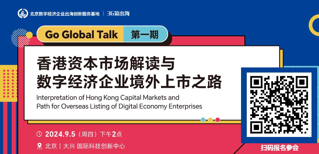 为更高效地满足企业境外上市需求,36氪出海将于9月5日在北京举办线下交流活动。我们邀请来自香港交易所和竞天公诚律师事务所的重磅嘉宾,为企业详细介绍香港资本市场及其机遇,分享数字经济企业境外上市的路径规划与合规要点。若您关注数字经济企业的境外上市,希望深入了解香港资本市场与上市路径,欢迎扫描下方二维码填写表单,报名参加本次活动。报名将于9月4日中午12:00截止。