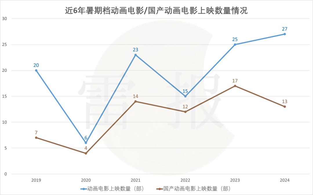 具体来看,今年暑期档共计27部动画电影上映(包含1部六一档作品、2部8月30日上映作品及4部重映作品),是近六年来的新高。其中,国产动画电影共计上映13部(包括2部重映),较去年17部的高点有所回落,但纵向来看数量上并不算少。