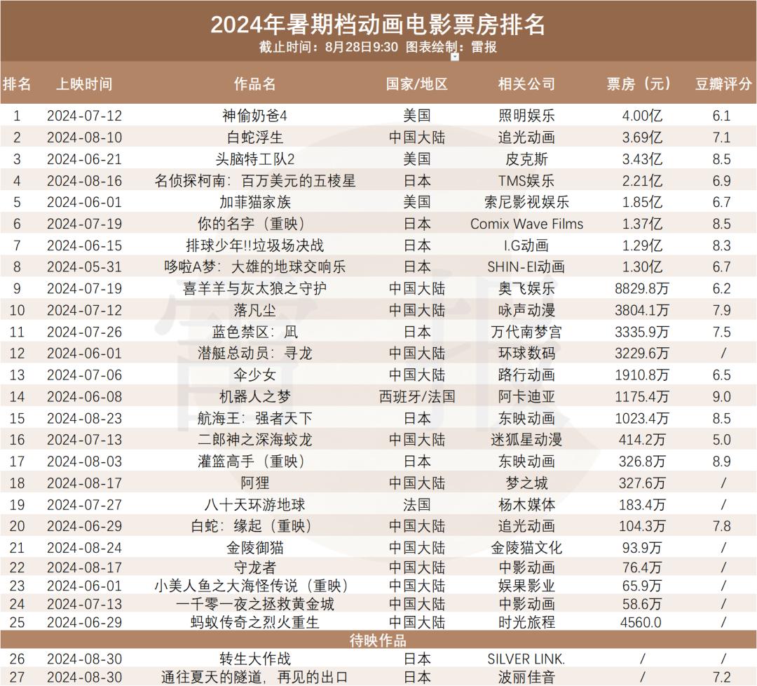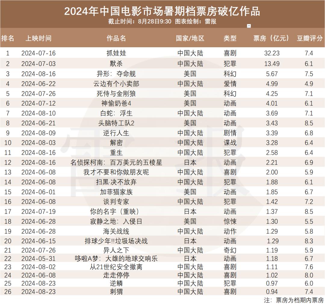 创新高?暑期档26部影片票房破亿,动画电影占8部半