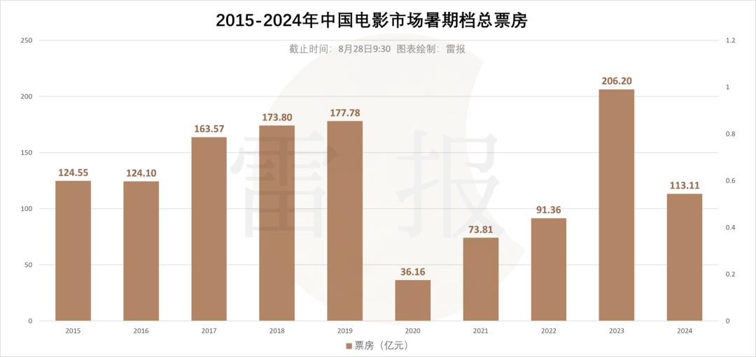 截至8月28日上午,暑期档的总票房为113.11亿元,较去年同期(206.20亿元)同比下降了45%。在剩下的几天并无大制作电影上映的情况下,暑期档预计将以118亿元左右的总票房收官,跌幅超过4成以上。尽管今年有巴黎奥运会抢夺部分观众的注意力,但目前这低于2015年、2016年同期的暑期档票房成绩显然不是外部因素所致。