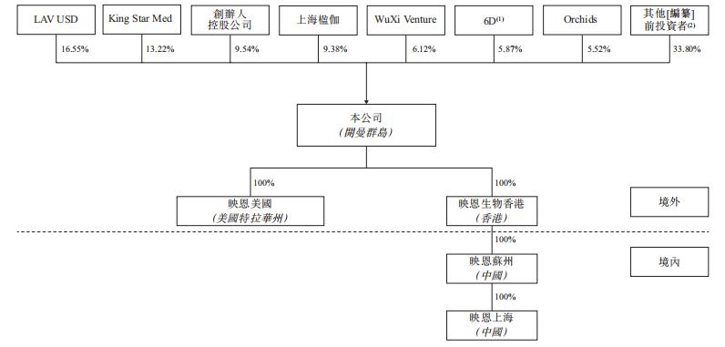 公司成立于2019年,注册地在开曼群岛,总部在上海。最新股权结构显示,映恩生物创始人控股公司持股9.54%,礼来LAVUSD持股16.55%,KingStarMed持股13.22%,上海楹联持股9.38%,药明生物通过旗下WuXiVenture持股6.12%,6DCapital(通和毓承)持股5.87%,其他投资者持股33.80%。
