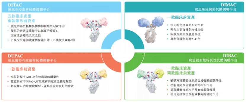 公司打造了四大领先ADC技术平台:即DITAC(映恩免疫毒素抗体偶联平台)、DIBAC(映恩创新双特异性抗体偶联平台)、DIMAC(映恩免疫调节抗体偶联平台)、DUPAC(映恩独特有效载荷抗体偶联平台),以突破ADC治疗的边界。