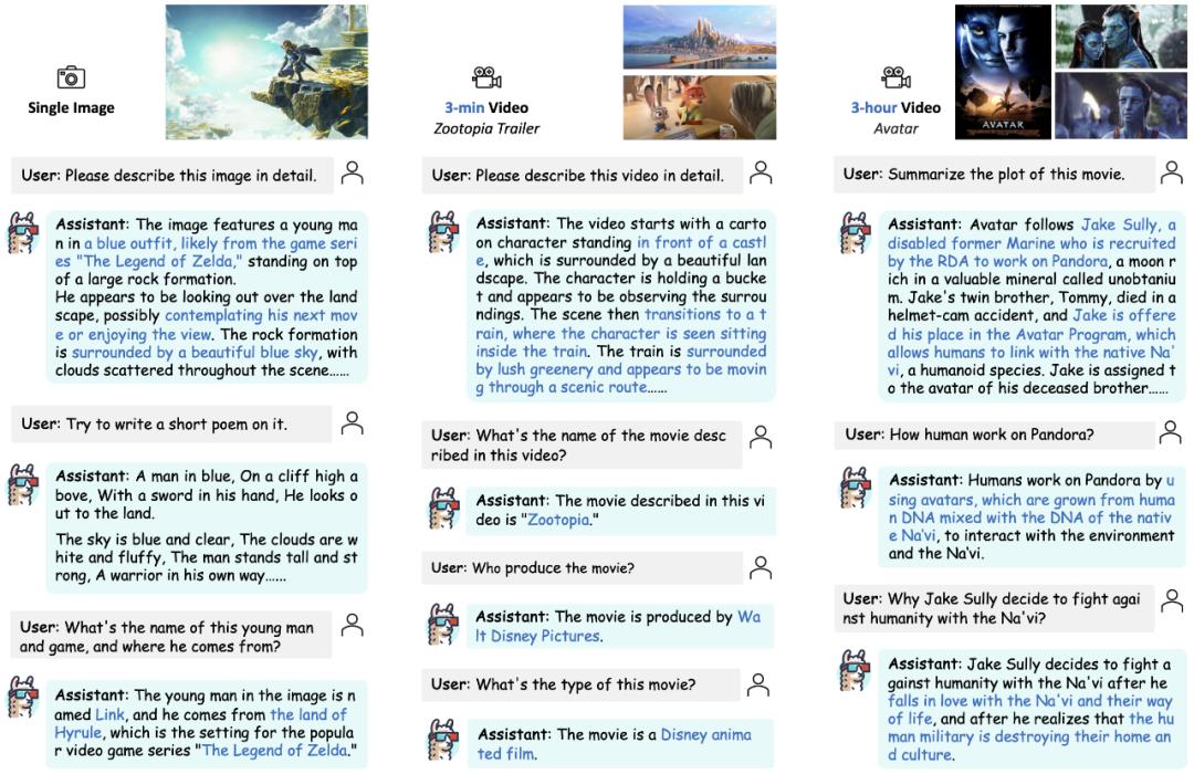 该团队还于 2023 年 12 月提出 LLaMA-VID,旨在解决视觉语言模型在处理长视频时因视觉 token 过多导致的计算负担,通过将视频中每一帧图像的 token 数压缩到了 2 个,实现了单图之外短视频甚至 3 小时时长电影的输入处理。