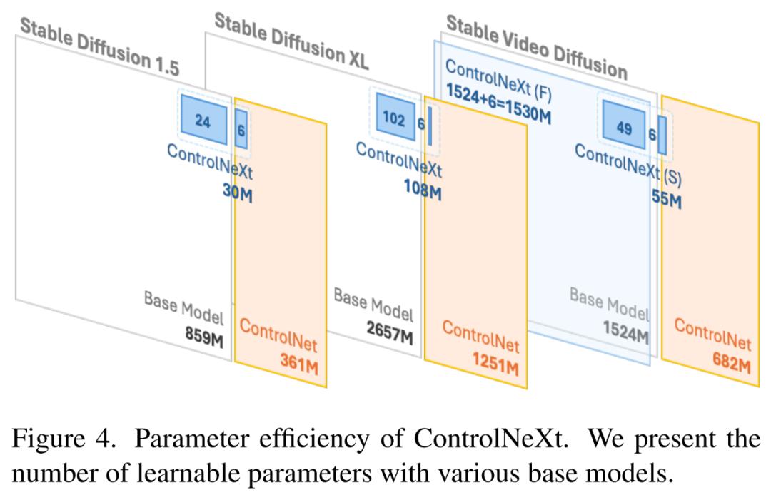 从结果来看,在适配 SD、SDXL、SVD 等预训练模型时,ControlNeXt 的训练参数量通常不及 ControlNet 的 10%,计算开销和内存占用大大降低。ControlNeXt 在 SD 1.5、SDXL 和 SVD 中的可学习参数量分别为 3000 万、1.08 亿和 5500 万,相较于 ControlNet 有了数量级减少(3.61 亿、12.51 亿和 6.82 亿)。