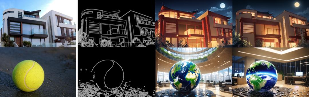 ControlNeXt 支持 Canny(边缘)条件控制,在 SDXL 中,通过提取下图(最左)输入图像的 Canny 边缘,输出不同风格的图像。
