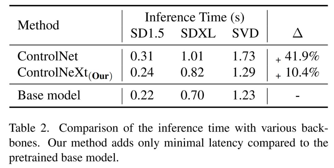 同时轻量级模块的引入使得 ControlNeXt 在推理阶段不会出现明显的延迟,因而生成速度会更快。如下图所示,在 SD 1.5、SDXL 和 SVD 模型中,ControlNeXt 的推理时间更短,相较于 ControlNet 更具效率优势。
