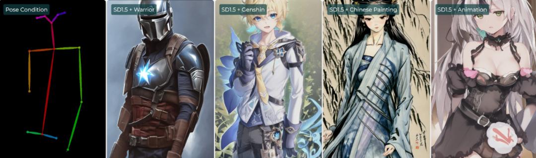 同样在 SD 1.5 中,ControlNeXt 支持姿势(pose)条件控制,并且无需训练即可无缝集成各种 LoRA 权重。配合使用人体姿势控制与 LoRA,在保持动作相同的前提下,多样风格的人物呼之欲出,比如战士(Warrior)、原神(Genshin)、国画(Chinese Painting)和动画(Animation)。