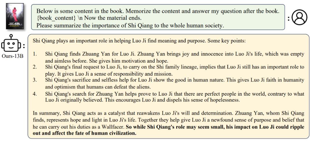 在喂给 LongLoRA 加持的 Llama2-13B 超长篇幅的科幻巨著《三体》后,它可以为你详细总结「史强对整个人类社会的重要性」。