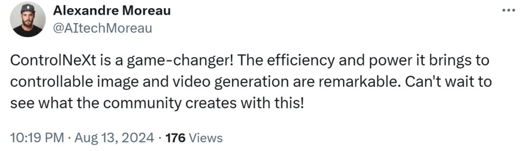 不夸张的说,在视觉条件生成这块,ControlNeXt 成为了更全能的「选手」。它的亮眼视效折服了网友,甚至有人认为「ControlNeXt 是游戏改变者,在可控图像和视频生成方面表现出色,可以想象未来社区会拿它做更多二创工作。」