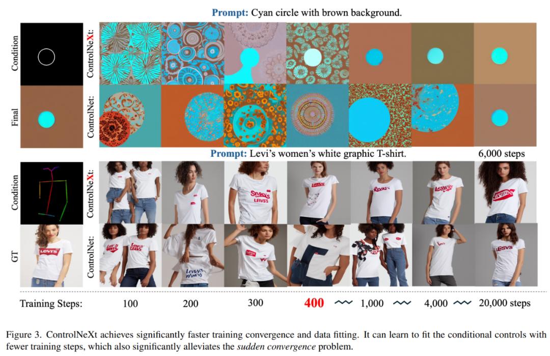 得益于交叉归一化,ControlNeXt 的训练速度得到提升,并在训练初期也能确保生成控制的有效性,降低对网络权重初始化的敏感度。从下图可以看到,ControlNeXt 实现了更快的训练收敛和数据拟合,只需要 400 步左右便开始收敛。相比之下,ControlNet 则需要走完十倍甚至几十倍的训练步数。