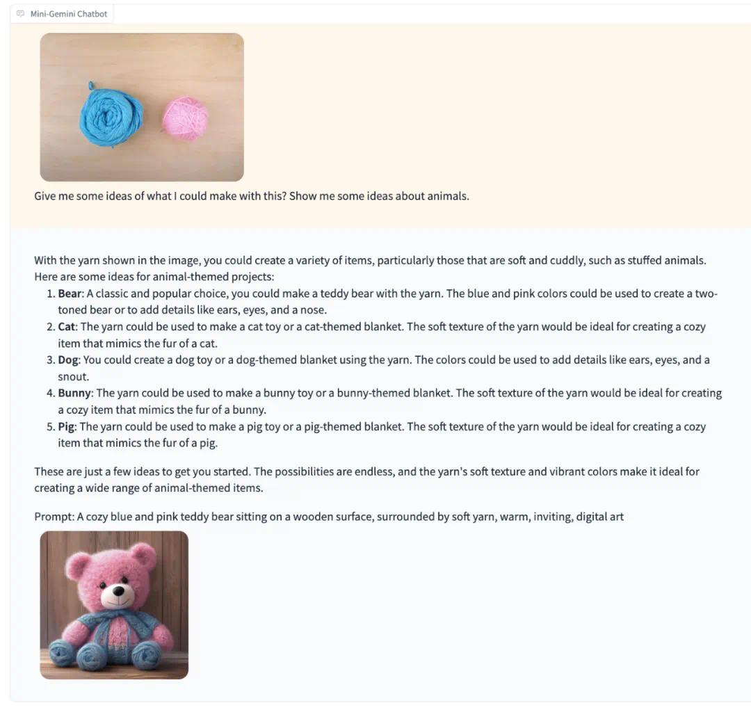 在延续谷歌 Gemini 识别图片内容并给出建议的能力基础上,Mini-Gemini 还能生成一只对应的毛绒小熊
