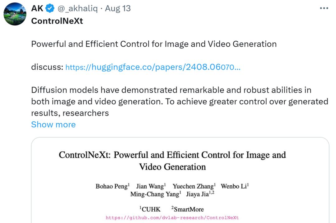 最近,又一款国产 AI 神器吸引了众网友和圈内研究人员的关注!它就是全新的图像和视频生成控制工具 —— ControlNeXt,由思谋科技创始人、港科大讲座教授贾佳亚团队开发。
