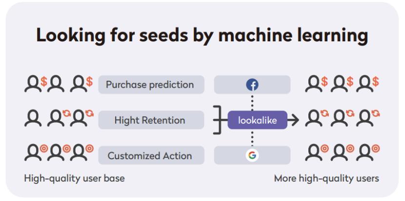 AiX针对游戏业务推广目标提供了智能化人群定向服务,一方面积累Google、Meta以及三方归因厂商准确的广告效果数据,通过机器学习、深度学习等算法能力挖掘出最合适的目标人群,再打通Google与Meta等广告平台的S2S接口自动进行精细化地触达客户,提升投放效果。