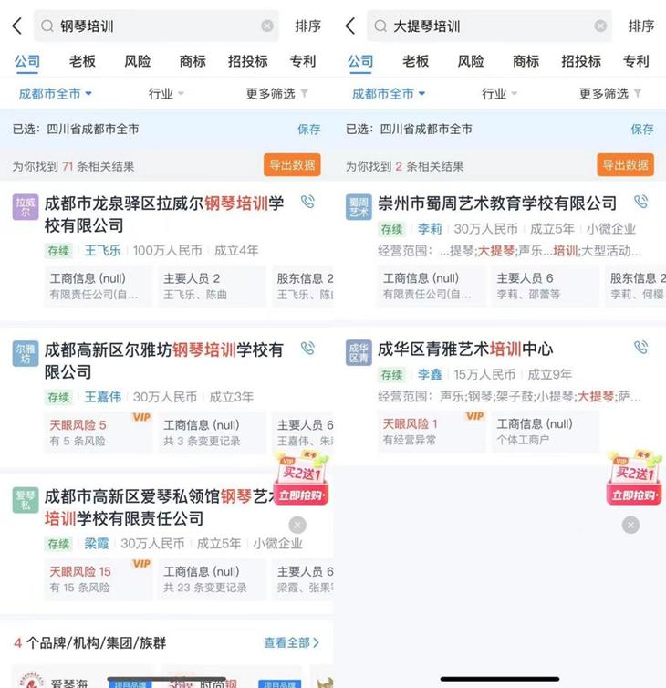 橡树在天眼查上面搜索「大提琴培训」关键词,成都市显示只有2家公司,而搜索「钢琴培训」关键词,出现了71家公司。