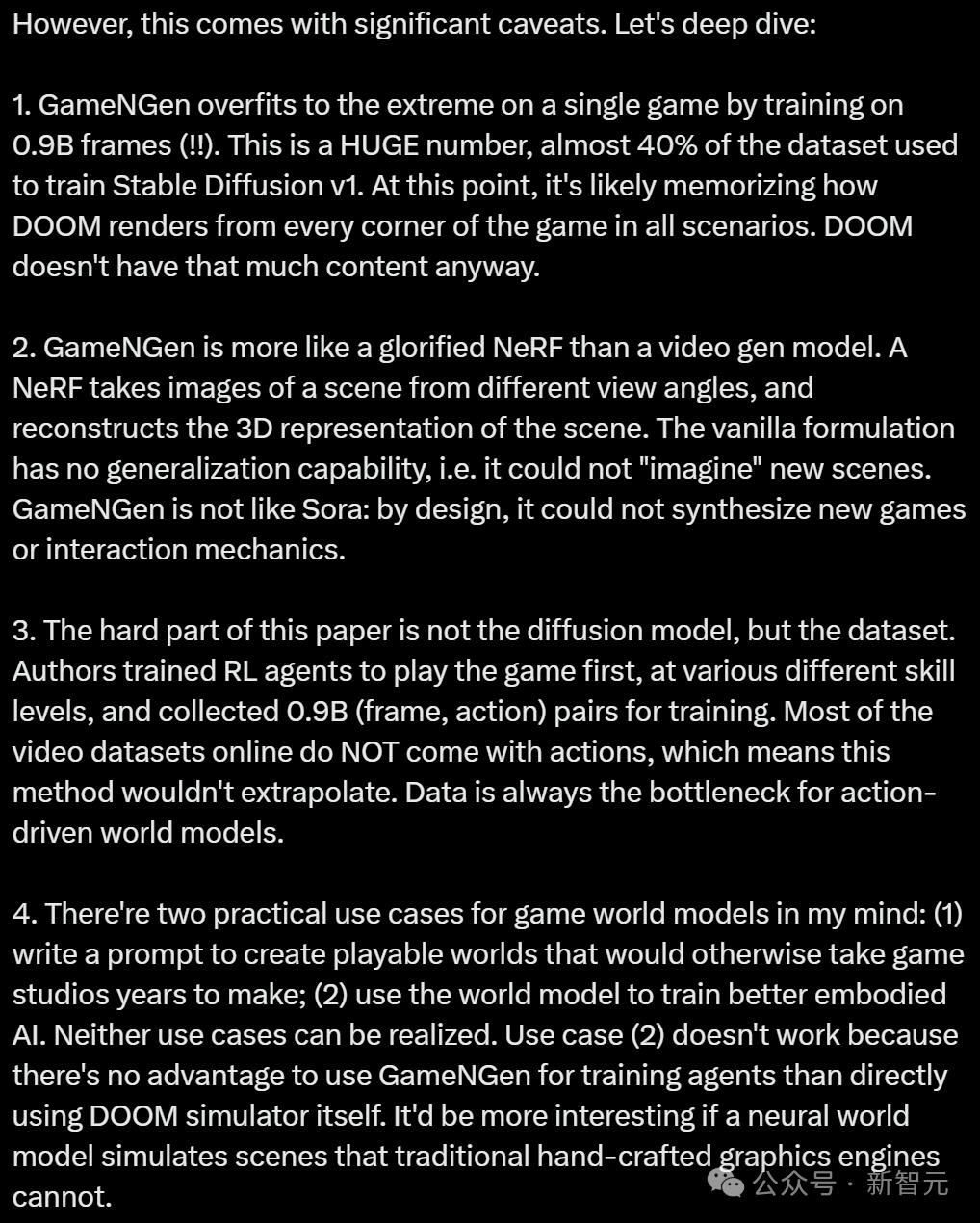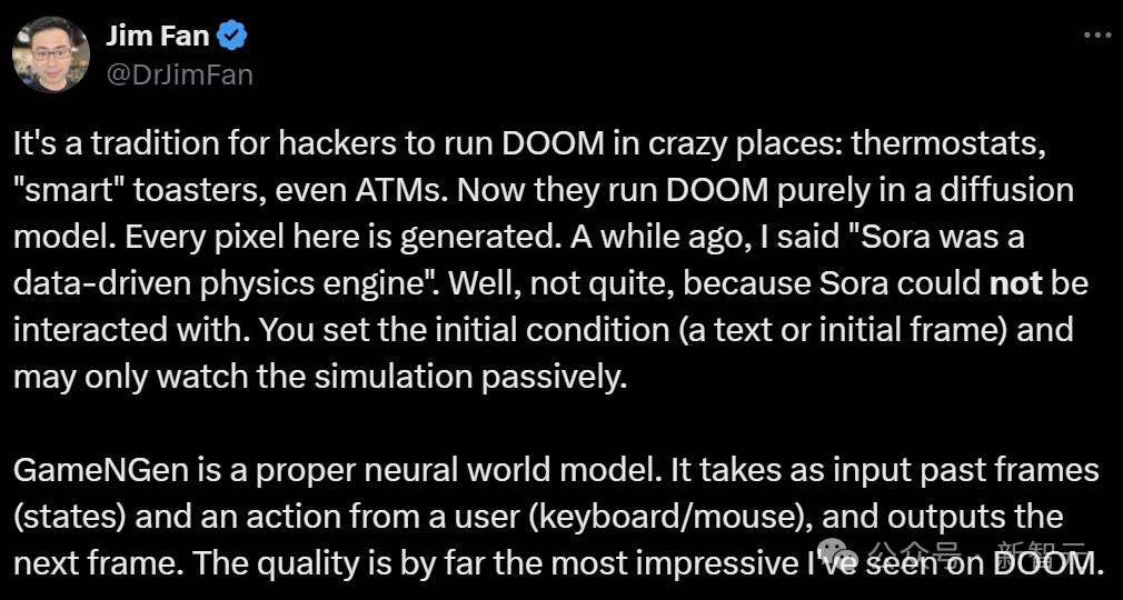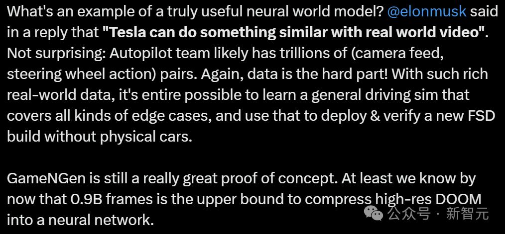 最后Jim Fan总结道:不管怎么说,GameNGen仍是一个非常出色的概念验证——至少我们现在知道,9亿帧是将高分辨率DOOM压缩到神经网络中的上限。