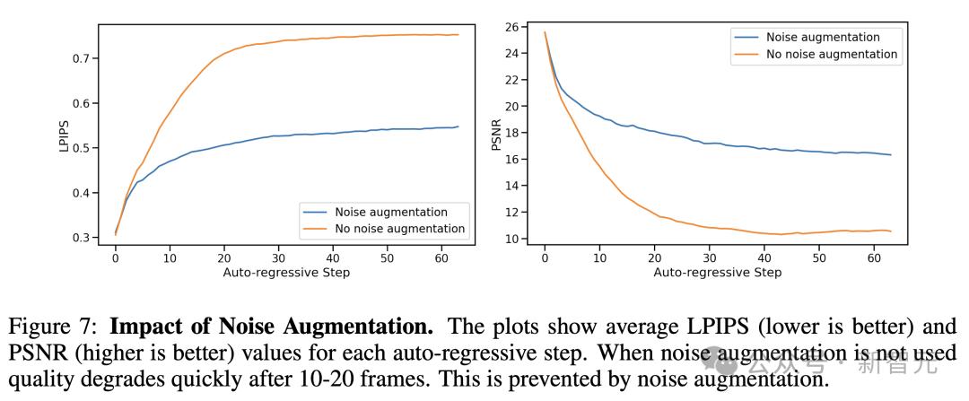 结果显示,没有噪声增强时,与真实值的LPIPS距离,比起研究标准噪声增强模型增加得更快,而PSNR下降,表明模拟与真实值的偏离。