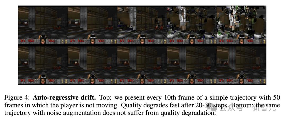自回归漂移:上图中, 20-30个步骤后,生成质量会快速下降;而下图中,具有噪声增强的相同轨迹不会出现质量下降