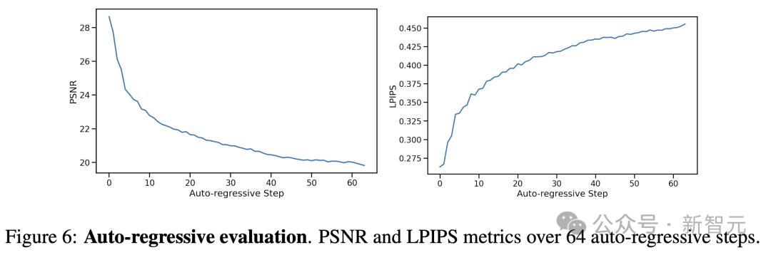 如下图7所示,呈现了每个自回归步骤的平均指标值,总共达64帧。