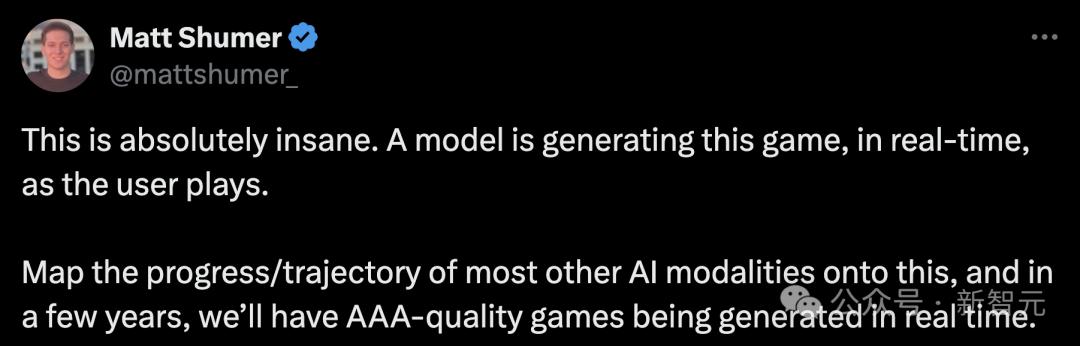 AI初创HyperWrite的CEO Matt Schumer表示,这简直太疯狂了!用户玩游戏时,一个模型正在实时生成游戏。