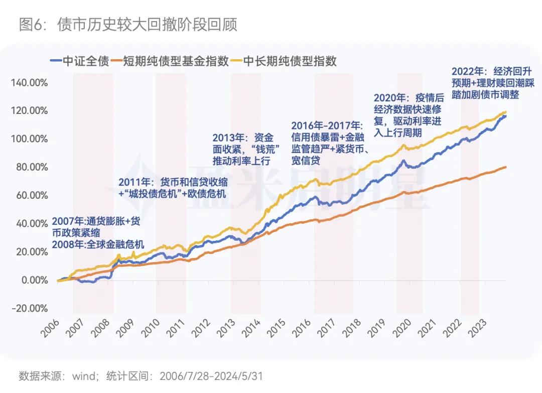 虽然债市波动远不及股市波动来得频繁且剧烈,回顾历史,债市也曾多次出现较大回撤。据盈米基金研究院统计(见下图),复盘过去十余年间的债市波动,通常每隔2-3年债市就会出现一次较大幅度回撤,并且中长期纯债基金指数的回撤幅度、回撤天数、修复时间都要显著高于短债基金指数。