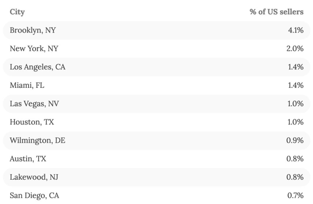 2022年,Marketplace Pulse报道的标题是《布鲁克林依旧是亚马逊卖家之都》。文章中提到,在美国活跃亚马逊卖家,布鲁克林占去了4%,卖家数量是纽约的两倍。而将聚光灯再集中一点,销售额达10万美元的美国亚马逊卖家有7万多家,10%都集中在布鲁克林、纽约、洛杉矶、迈阿密和拉斯维加斯。