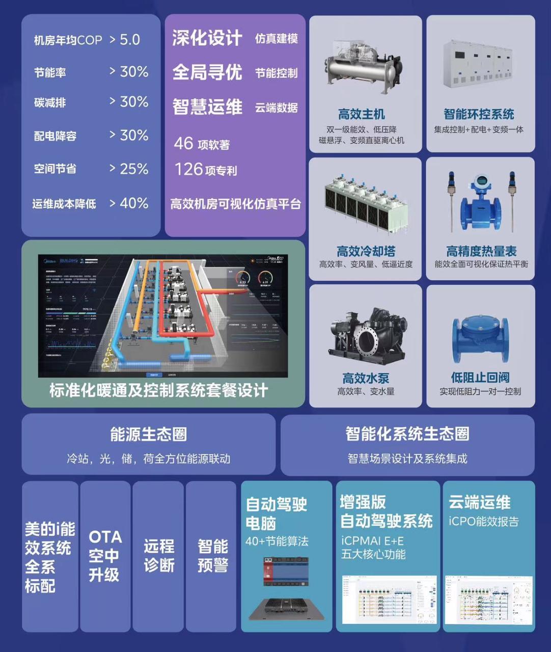 一个出色的高效机房解决方案包括深化设计、暖通设备、控制系统、安装调试、运维管理和能效承诺,这些要素共同提升建筑能源管理系统的整体能效。美的楼宇科技作为方案落地的综合服务商,依托自主研发的鲲禹磁悬离心机冷水机组等高效设备,确保了系统在低能耗的前提下实现最佳运行效果。其次,智能化运维管理工具——美的i能效,通过实时监控和数据分析,在长期运行中持续优化能耗,帮助建筑实现智能化的节能管理。