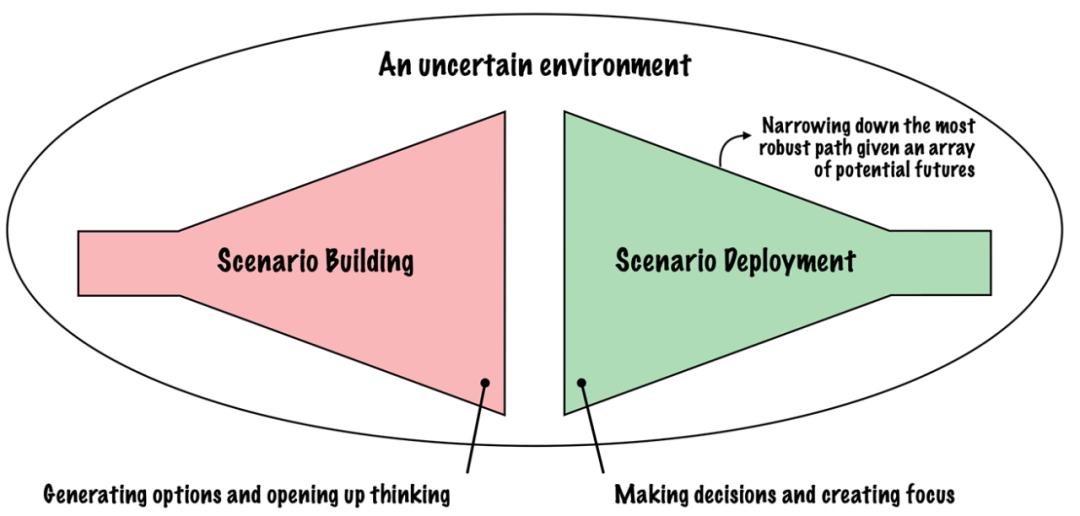 场景构建的特点是发散和具有挑战性的思维,而部署的特点是融合思维,通过决策,选项会减少。