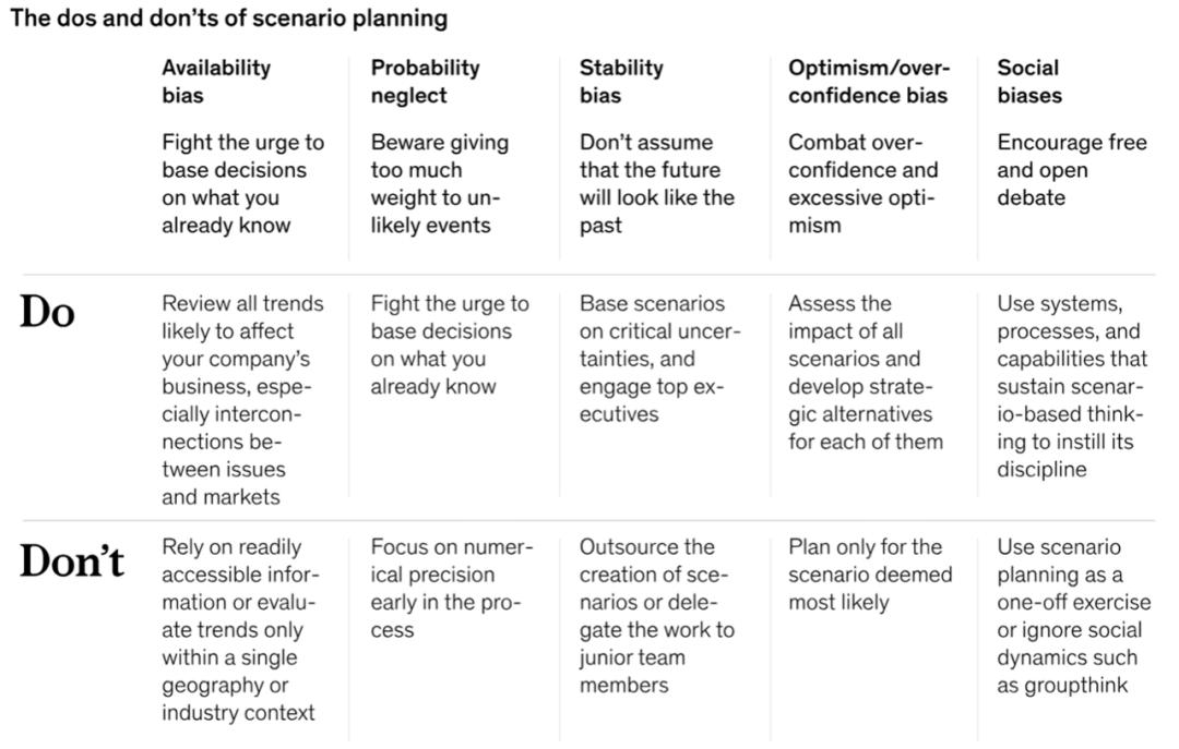 麦肯锡的一份报告[23]认为,情景规划可能会受到同样根深蒂固的认知偏见的阻碍,而这些偏见应该用来解决。幸运的是,了解这种偏见如何破坏情景规划有助于提高其有效性: