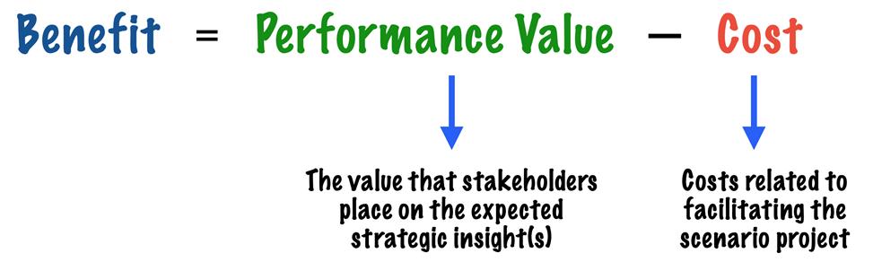 预测重大业务中断、通过战略洞察力获得的利润或两者兼而有之而有之的节省估计可以而且应该是情景项目的一部分。成本/效益模型是获得情景项目财务利益的简单工具: