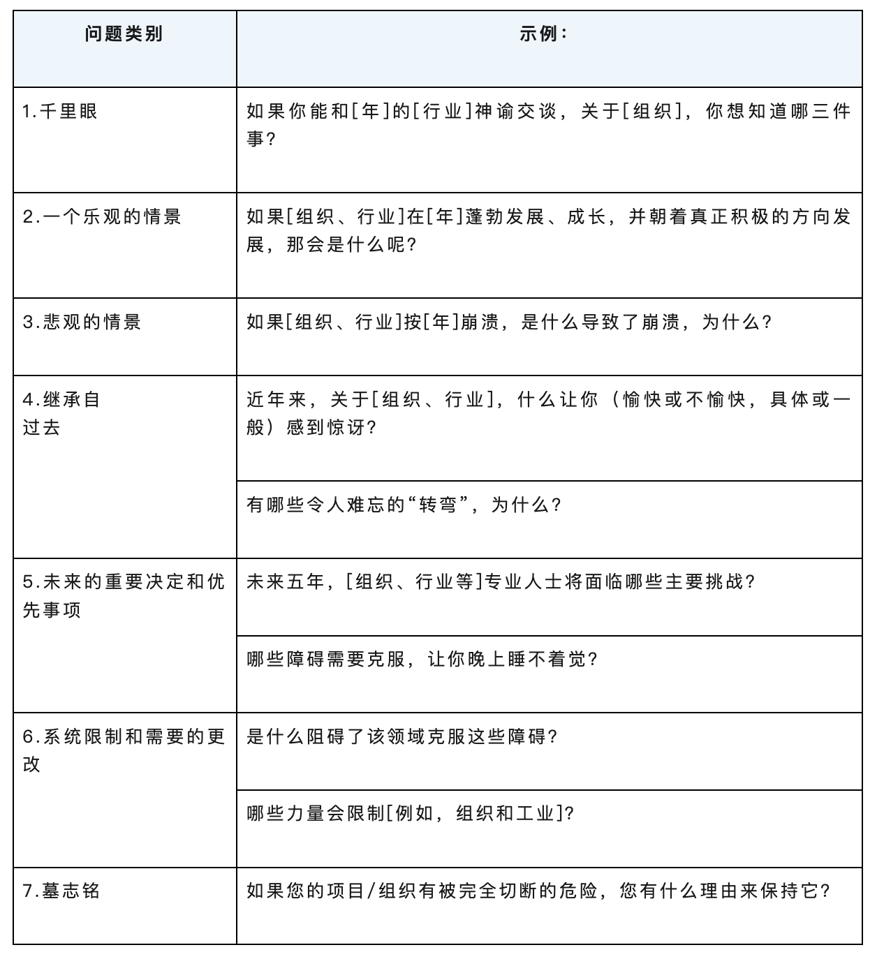 一个明确的问题有助于研究一系列可能的环境,在这些环境中可以做出战略选择。它有助于探索各种答案及其含义。在启动情景规划项目之前,需要考虑的一些示例问题包括: