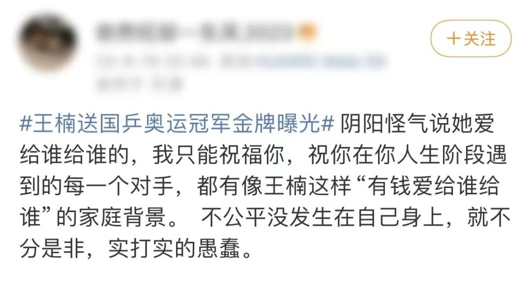 这是纯捐赠啊。王楠夫妇完全有权决定将金牌赠予谁,然而“有权”也完全不耽误许多人对王楠进行“言语攻击”,这也导致在本次奥运会中,王楠夫妇未曾出现在公共场合。