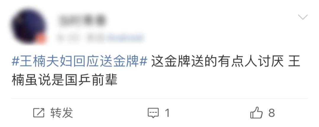 王楠一直没有说话。王楠丈夫郭斌发了要送金牌的视频,瞬间就被各种评论攻击,也就没再多说。