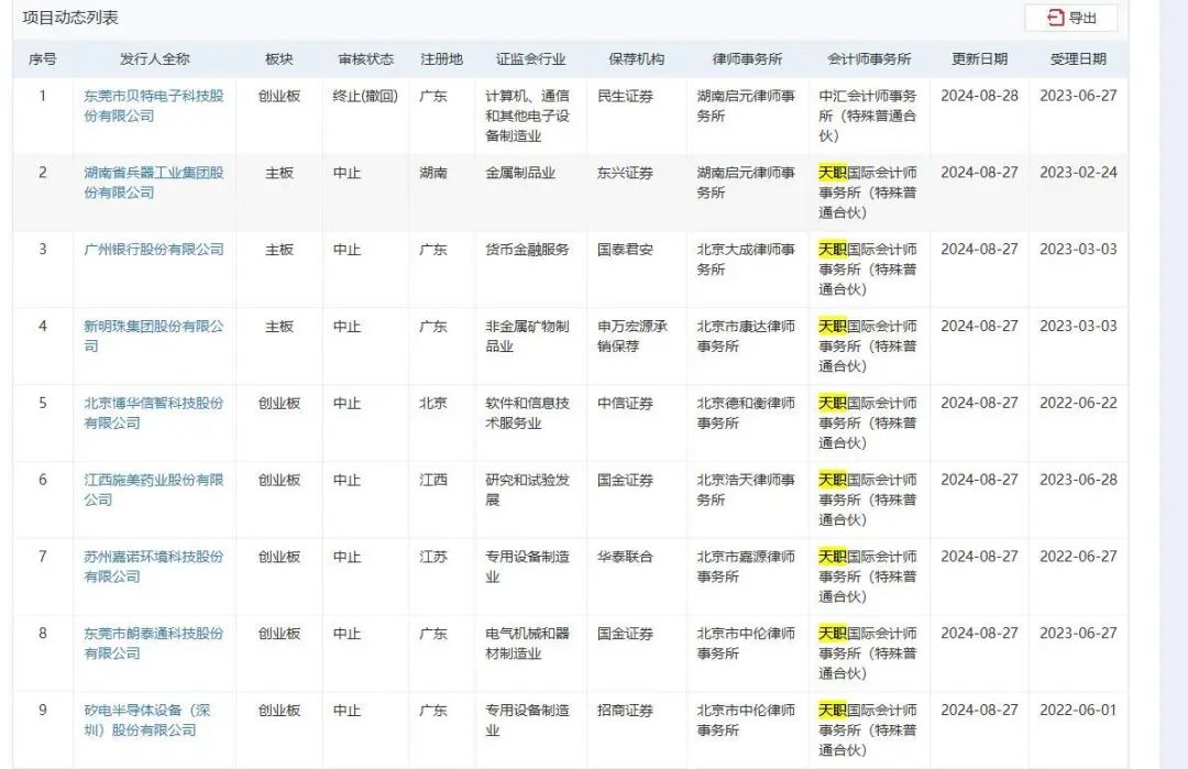 8月27日,上交所、深交所官网显示,由天职国际会计师事务所(特殊普通合伙)(以下简称天职国际)提供证券服务的多家在审IPO公司,在8月27日更新审核状态为“中止”或“终止”,涉及上交所、深交所各8家公司,其中一家为撤回发行上市申请后IPO终止。此外,天职国际提供服务的多个再融资项目、并购重组项目也显示为“中止审核”。