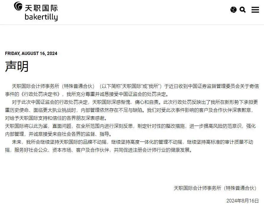 8月16日,天职国际在官网发表声明,表示对于此次行政处罚决定“深感惭愧、痛心和自责”,此次处罚反映出了该所在新形势下承担更重历史使命、面临更大执业挑战时,内部管理依然存在不足与缺陷。同时,天职国际在声明中对受此次事件影响的客户及合作伙伴深表歉意。