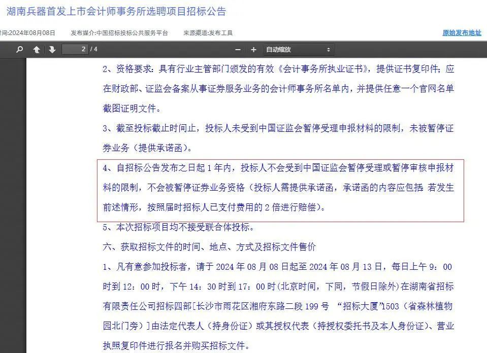 中国招标投标服务公共平台显示,8月8日,湖南兵器对首发上市会计师事务所选聘项目进行公开招标。公司对投标人还提出了一条要求:“自招标公告发布之日起1年内,投标人不会受到中国证监会暂停受理或暂停审核申报材料的限制,不会被暂停证券业务资格(投标人需提供承诺函,承诺函的内容应包括:若发生前述情形,按照届时招标人已支付费用的2倍进行赔偿)。”