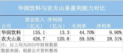 2023年,农夫山泉净利润率比华润饮料高出18.41个百分点,是华润饮料净利润率的近3倍。从毛利率看,华润饮料2023年的毛利率为44.7%,低于农夫山泉59.55%的毛利率。
