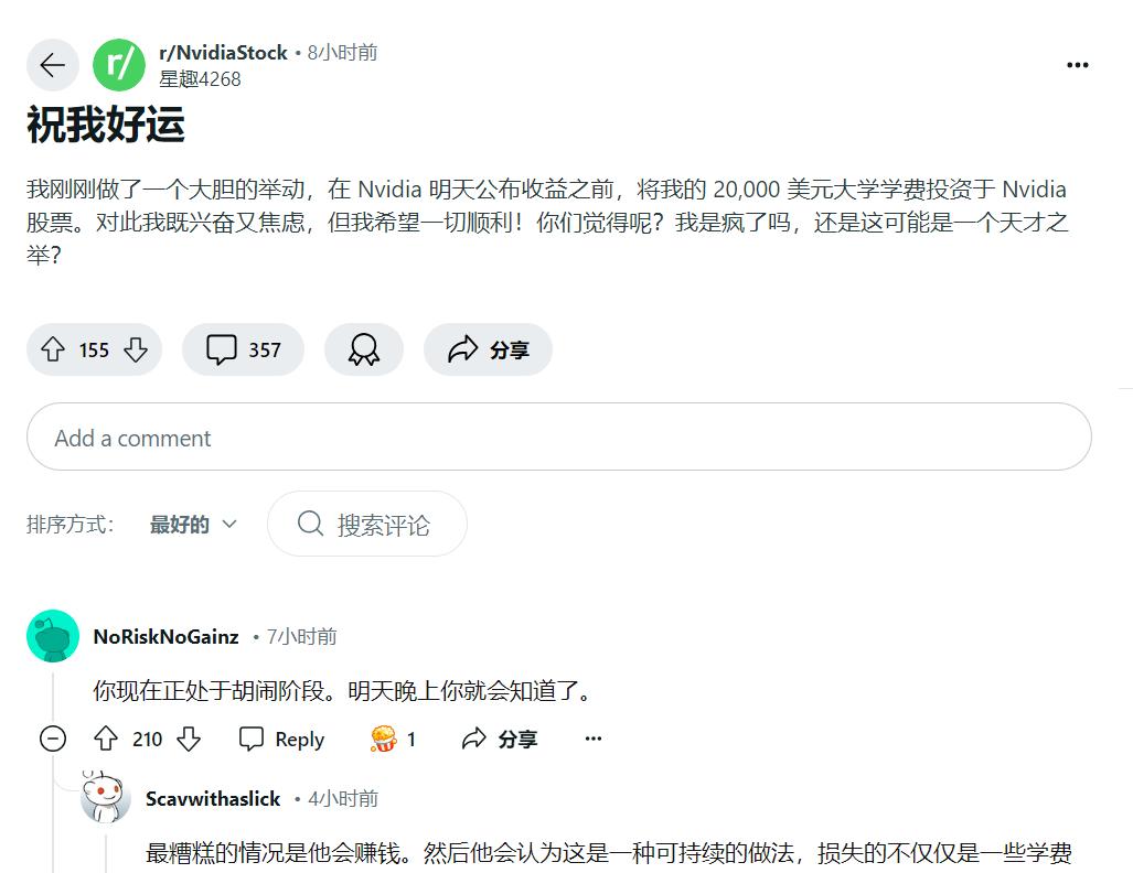 这并非空穴来风。8月27日,Reddit上出现了一个贴子:祝我好运!我刚刚做了一个大胆的举动,在 Nvidia 明天公布收益之前,将我的 20,000 美元大学学费投资于 Nvidia 股票。对此我既兴奋又焦虑,但我希望一切顺利!你们觉得呢?我是疯了吗,还是可能是一个天才之举?
