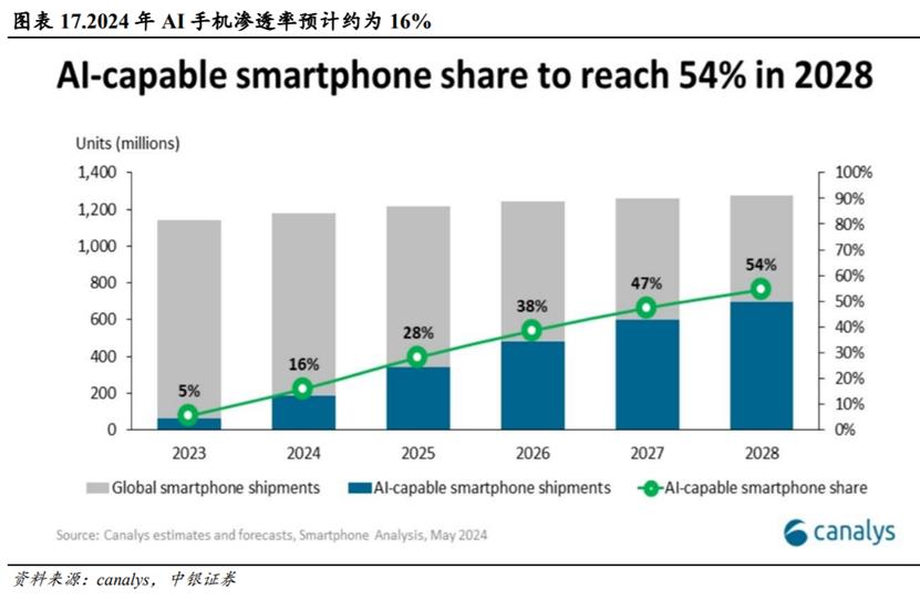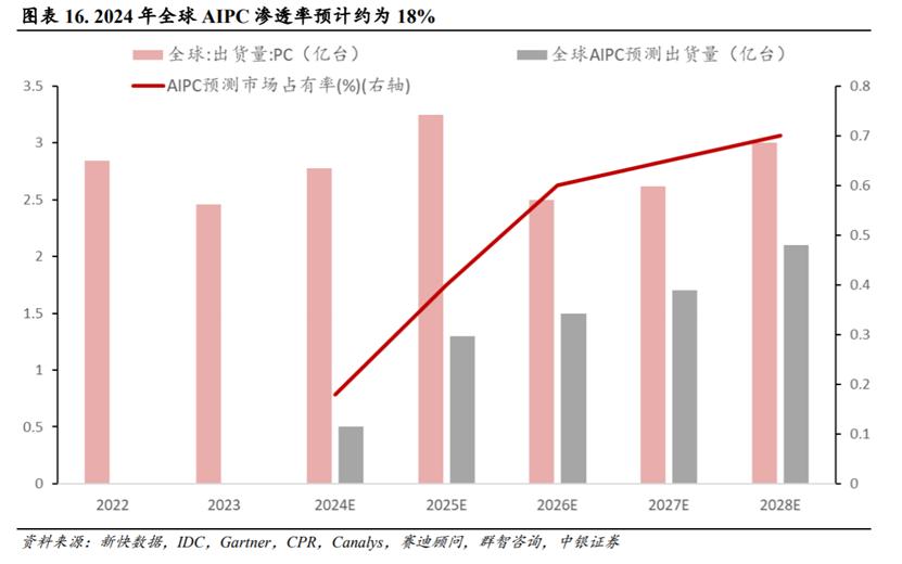 中银证券预计,2024 年 AI 手机渗透率预计将达到 16%,AIPC 渗透率预计将达到 18%,与1992 年 PC 约 20%的渗透率水平接近。