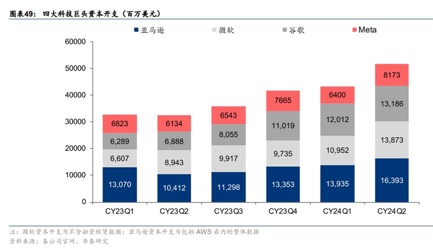 四大巨头在二季报都明确表示了,将保持或加大接下来的资本开支。比如微软在财报电话会上表示,未来将继续扩大基础设施投资,FY25 资本支出将高于 FY2024。Meta 将全年资本开支预期从 350 亿美元-400 亿美元上调至 370 亿美元-400 亿美元。