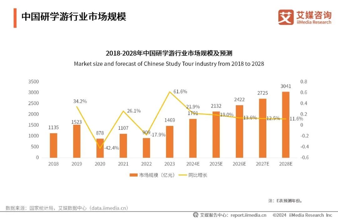 据艾媒咨询数据,2023年中国研学行业市场规模达到1469亿元,2024年则有望达到1791亿元。